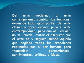 El documento discute cómo el arte moderno cambió las técnicas artísticas al alejarse del arte clásico y abrir espacio para el arte contemporáneo. Sin embargo, el arte sigue siendo aquello que permite transmitir pensamientos, sentimientos, críticas e ideas a través de las creaciones humanas. También menciona algunos artistas colombianos como Fernando Botero, Luis Caballero Holguín y José Rodríguez cuyas obras se exhiben actualmente en diferentes museos de Colombia como el Museo de la Casa de la Moneda y el Ban