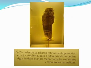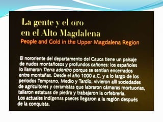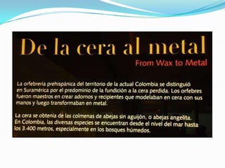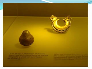 El documento presenta información sobre dos museos visitados por estudiantes de historia del arte: el Museo del Oro en Bogotá y el Museo Botero. Resume el arte precolombino exhibido en el Museo del Oro, con énfasis en el trabajo en oro y cobre de culturas colombianas. Luego describe las colecciones del Museo Botero, incluyendo obras donadas por Fernando Botero y una colección internacional que incluye obras de Picasso, Miró y Delaunay.