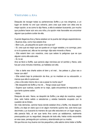 Luis lleva a una niña llamada Soffie al refugio de Ana para que quede bajo su protección, ya que su vida corría peligro si se quedaba con él. Ana acepta cuidar de Soffie y le promete a Luis que la niña estará a salvo y feliz con ella. Luis se despide de Soffie preocupado por su seguridad, confiando en que Ana la tratará con cariño. Antes de irse, Luis le pide a Ana que se asegure de que Soffie esté bien y que le informe sobre ella.