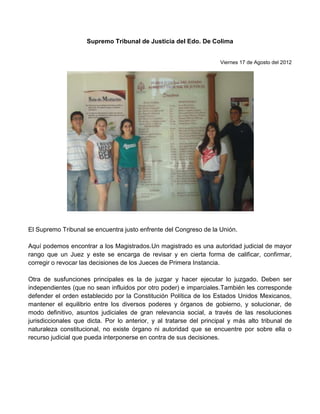 El Congreso de Colima está integrado por 25 diputados electos. Sus principales atribuciones incluyen reformar la constitución local, legislar sobre todos los asuntos de la administración, y aprobar leyes y presupuestos. El Supremo Tribunal de Justicia se encuentra frente al Congreso y sus magistrados revisan las decisiones de los jueces de primera instancia y juzgan casos de gran relevancia. La Presidencia Municipal de Cuauhtémoc tiene oficinas para el presidente, secretario general, tesorería, desarrollo económico y servicios