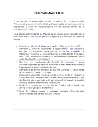 La Cámara de Diputados es la cámara baja del Congreso de México, compuesta por 500 diputados electos cada tres años para representar a los ciudadanos. Los diputados deben ser ciudadanos mexicanos mayores de 21 años y pueden proponer proyectos de ley para sus comunidades. El Poder Ejecutivo Federal dirige la administración pública del país y el Presidente tiene poderes como promulgar y ejecutar las leyes y nombrar a funcionarios públicos. La Suprema Corte de Justicia de la Nación es el máximo