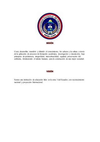 La misión de la Universidad Nacional de Chimborazo es crear, desarrollar y difundir el conocimiento a través de la formación académica, investigación y vinculación con la comunidad bajo principios de equidad e interculturalidad para construir una mejor sociedad. Su visión es ser una institución líder en educación en la zona 3 de Ecuador con reconocimiento nacional e internacional. La Facultad de Ciencias de la Educación Humana y Tecnologías forma maestros de acuerdo a tendencias pedagógicas contemporáneas para br