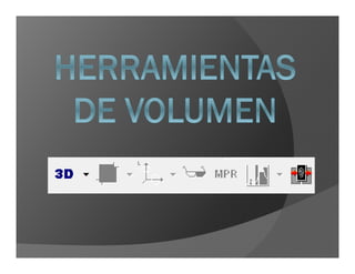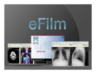 Este documento describe las funciones y herramientas de la aplicación eFilm, la cual se utiliza para visualizar y manipular imágenes médicas. Explica las diferentes barras, menús y herramientas disponibles para buscar, cargar, navegar, ajustar y medir imágenes, así como para aplicar filtros, plantillas y efectos 3D.