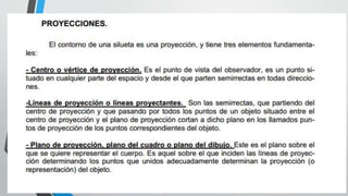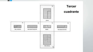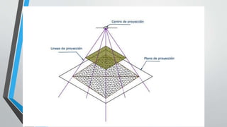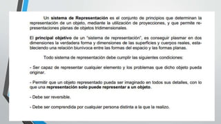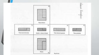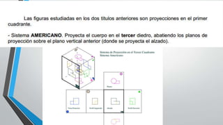 El documento describe los sistemas europeo y americano para proyecciones y vistas de objetos. En el sistema europeo, el plano se coloca detrás del objeto y hay seis vistas principales (alzado frontal, planta superior, vistas laterales izquierda/derecha, alzado posterior, planta inferior) ubicadas en un paralelepípedo. En el sistema americano, el proyector se coloca delante del objeto y las vistas se sitúan con el alzado frontal en el centro, la planta superior encima y la vista lateral derecha a la iz