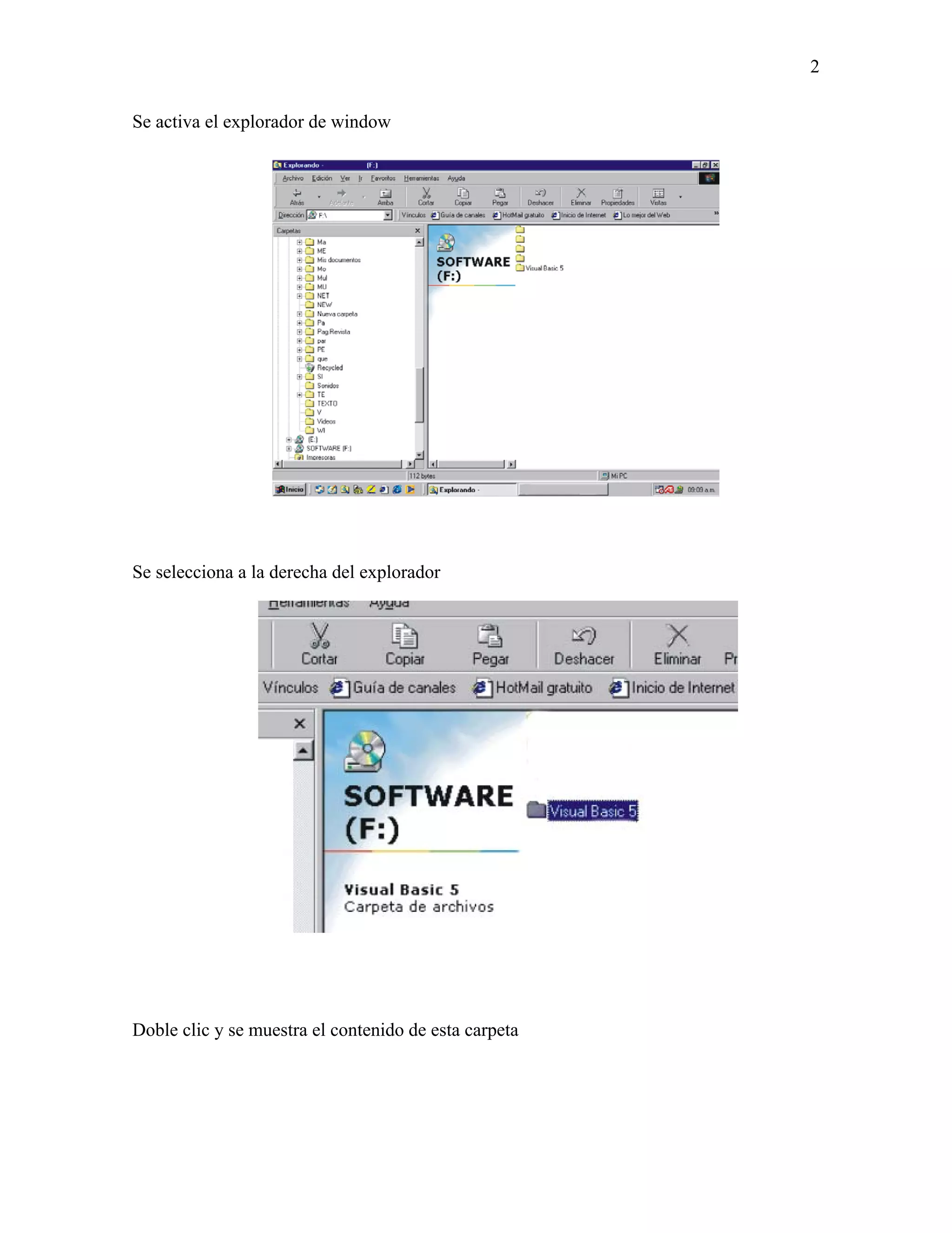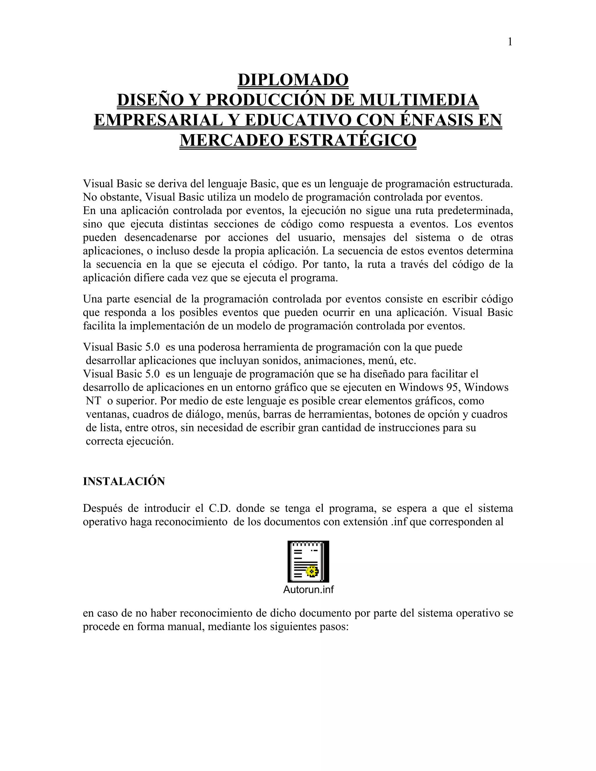 Este documento presenta instrucciones para instalar y utilizar el programa Visual Basic 5.0. Explica cómo crear una aplicación sencilla con un formulario, un botón de comando y una etiqueta de texto. Al hacer clic en el botón, el texto en la etiqueta cambia para dar la bienvenida al usuario al diplomado. También incluye instrucciones para dos ejercicios prácticos que enseñan a ocultar y mostrar el texto al hacer clic en diferentes botones, y a crear una presentación de 800x600 píxeles.