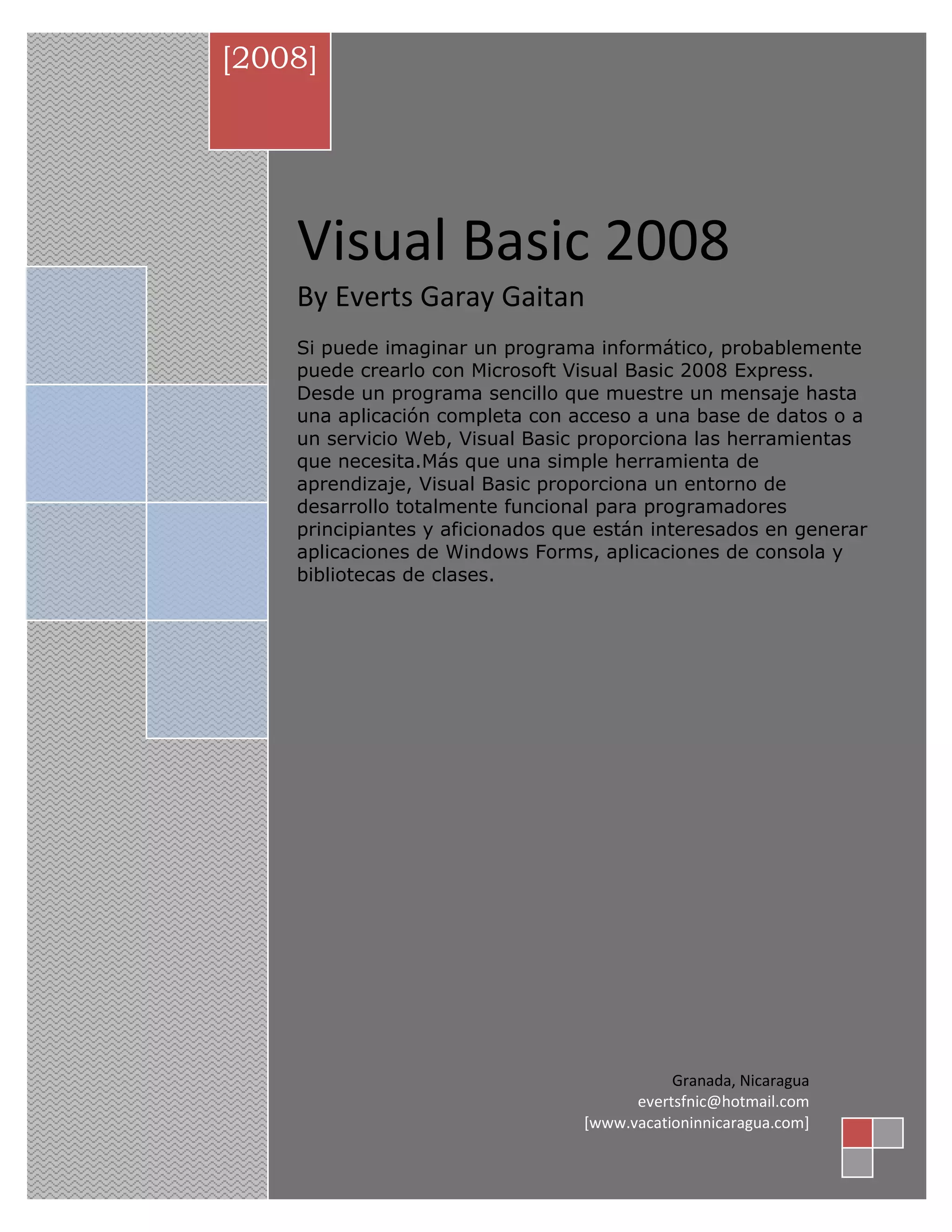 Este documento proporciona una introducción a Visual Basic 2008 Express. Explica que Visual Basic Express puede usarse para crear aplicaciones simples o complejas y que proporciona un entorno de desarrollo completo para principiantes y aficionados. También describe brevemente el proceso de desarrollo de aplicaciones en Visual Basic Express, que incluye la creación de un proyecto, el diseño de la interfaz de usuario, la escritura de código y la prueba y distribución de la aplicación.
