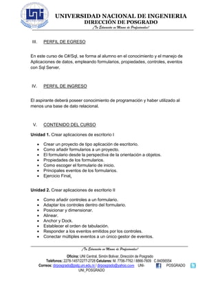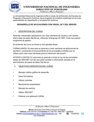 La Universidad Nacional de Ingeniería ofrece un curso especializado de capacitación en el desarrollo de aplicaciones con Visual C# y SQL Server. El curso consta de 21 unidades que cubren temas como la creación de interfaces gráficas, el uso de controles, el acceso a datos mediante ADO.NET y el desarrollo de aplicaciones en escenarios conectados y desconectados. El objetivo es formar al alumno en el conocimiento y manejo de aplicaciones de datos utilizando formularios, propiedades, controles, eventos y SQL Server.