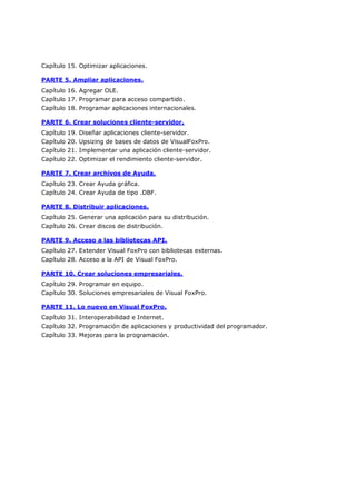 Este manual proporciona información sobre la programación en Visual FoxPro. Cubre temas como los conceptos básicos de programación, cómo crear y modificar programas, y cómo integrar código en formularios, clases e informes. El manual consta de 10 partes y 33 capítulos que explican todo, desde los fundamentos de la programación hasta la creación de aplicaciones cliente-servidor avanzadas.