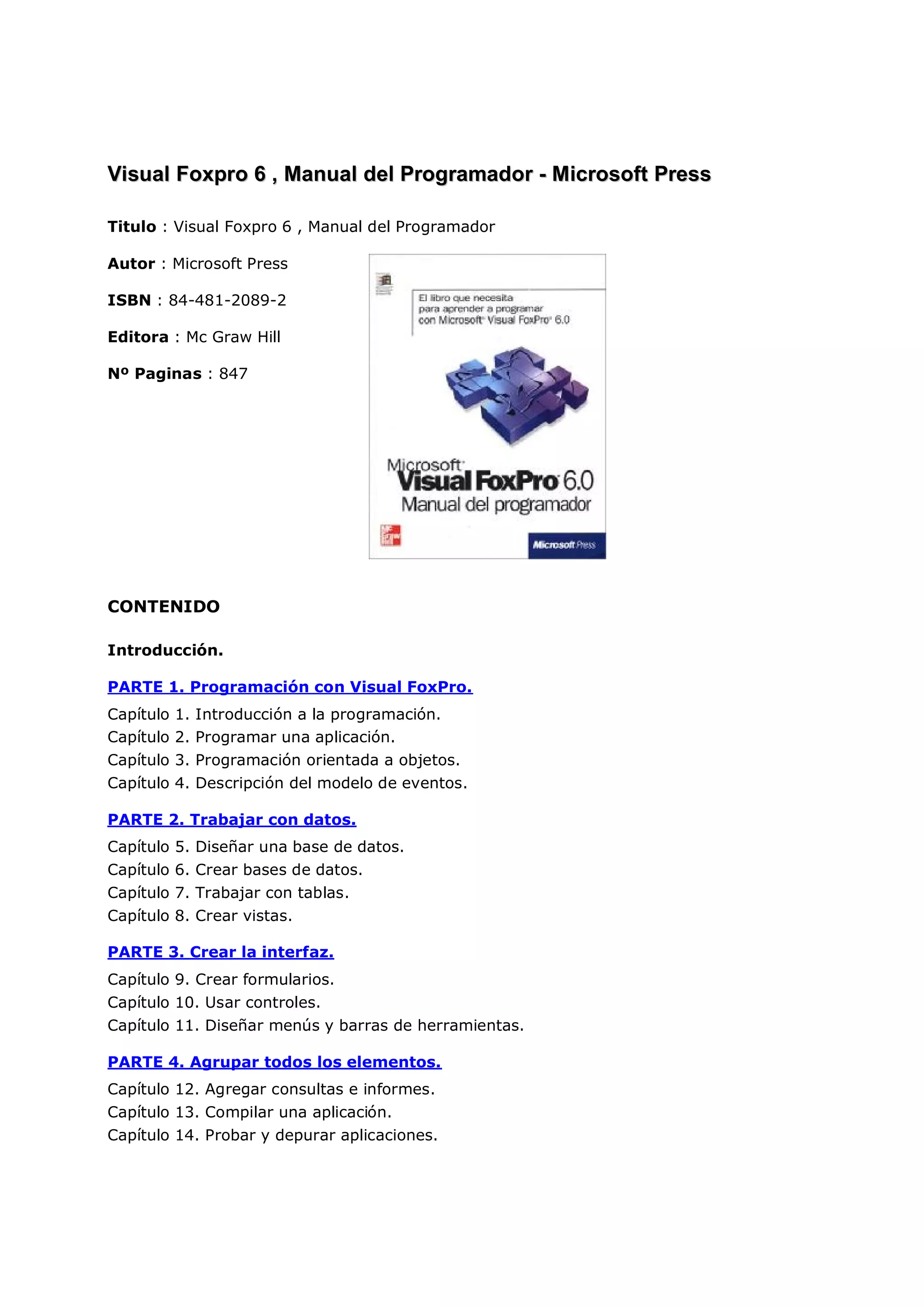 Este documento proporciona un resumen del libro "Visual Foxpro 6, Manual del Programador" publicado por Microsoft Press. El libro contiene 31 capítulos organizados en 11 partes que cubren temas como la programación básica en Visual FoxPro, programación orientada a objetos, diseño de interfaces gráficas, acceso a datos, desarrollo de aplicaciones cliente-servidor y distribución de aplicaciones. El libro proporciona información detallada para ayudar a los programadores a aprovechar todas las capacidades de Visual Foxpro.