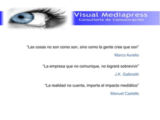 Este documento presenta una consultora de comunicación y relaciones públicas. Explica que su misión es mejorar los resultados de los negocios de sus clientes utilizando la comunicación como herramienta. Detalla los servicios que ofrece como consultoría, gestión de prensa, redes sociales, organización de eventos y más, con el objetivo de mejorar la notoriedad y credibilidad de las marcas de sus clientes.