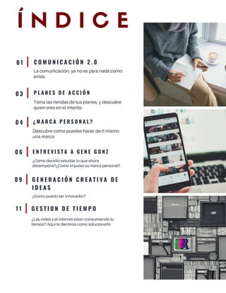 El documento explora la evolución de la comunicación en la era digital, destacando la importancia de la marca personal y la planificación estratégica para el éxito profesional. A través de una entrevista con Génesis González, se aborda cómo elegir una carrera, innovar y gestionar el tiempo de manera eficiente en un entorno digital. También se enfatiza la habilidad de observar y aprender de otros para crecer en el ámbito creativo y profesional.