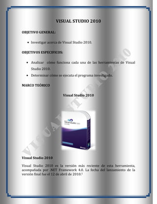 El documento describe Visual Studio 2010, un entorno de desarrollo integrado producido por Microsoft para desarrollar aplicaciones para Windows. Visual Studio 2010 incluye herramientas para desarrollar aplicaciones para Windows 7 y permite crear aplicaciones para plataformas como Windows, Azure y Windows Phone 7. El documento también resume las características y ediciones de versiones anteriores de Visual Studio.