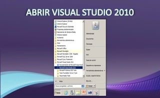 Visual Studio es un conjunto de herramientas de desarrollo que permite crear aplicaciones web, de escritorio y móviles utilizando lenguajes como C#, Visual Basic, C++ y F#. El documento explica cómo crear y administrar proyectos y soluciones en Visual Studio 2010.