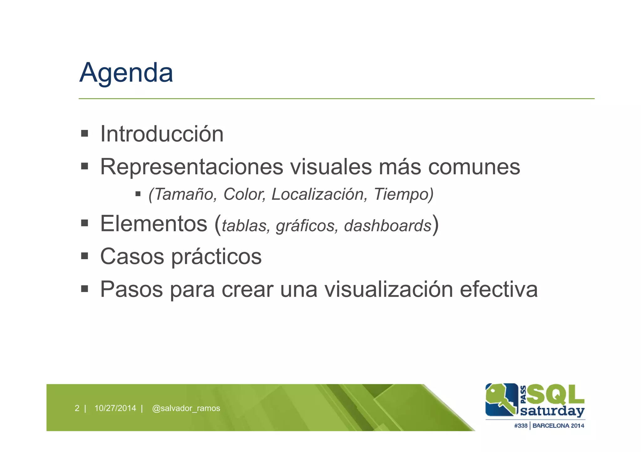 El documento trata sobre la importancia de las visualizaciones en la toma de decisiones empresariales, abordando tipos comunes como tablas, gráficos y dashboards. Se discuten pasos para crear visualizaciones efectivas y se advierte sobre potenciales tergiversaciones en la representación de datos. Además, se enfatiza la necesidad de formular preguntas adecuadas y seleccionar la representación visual correcta para optimizar la comunicación de información.