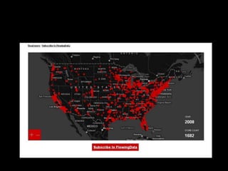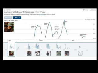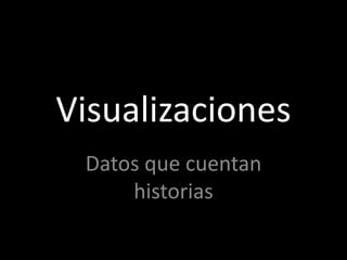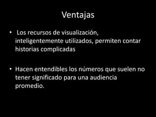 Este documento describe las ventajas de las visualizaciones de datos para contar historias complejas de una manera comprensible. Menciona a Hans Rosling y Jonathan Harris como buenos ejemplos de personas que usan visualizaciones para comunicar investigaciones y arte digital respectivamente. También enumera formatos comunes como mapas, gráficos de barras y líneas, nubes de palabras y mapas mentales, e identifica herramientas como Wordle y Google Docs que permiten crear estas visualizaciones.