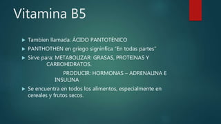 La vitamina B5, también llamada ácido pantoténico, sirve para metabolizar grasas, proteínas y carbohidratos y producir hormonas como la adrenalina e insulina. Se encuentra en muchos alimentos como cereales y frutos secos. Interviene en el metabolismo celular y la formación de insulina y hormonas suprarrenales. Un déficit puede causar dolor de cabeza, fatiga y síntomas neurológicos, mientras que dosis muy altas pueden causar diarrea.