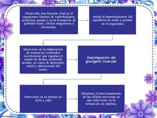 La vitamina B6 incluye tres compuestos químicos (piridoxina, piridoxal y piridoxamina) que intervienen en la síntesis de proteínas y producción de anticuerpos. Ayuda a absorber otras vitaminas B y magnesio, e interviene en la formación de hemoglobina. Se encuentra en alimentos de origen animal y vegetal. La deficiencia causa síntomas como anemia y fatiga.