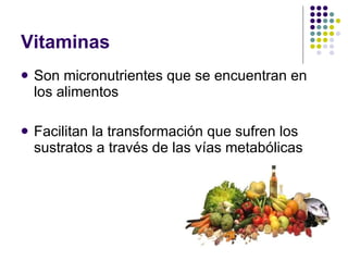 Las vitaminas son micronutrientes que se encuentran en los alimentos y facilitan las reacciones químicas en el cuerpo. Existen vitaminas liposolubles como las vitaminas A, D, E y K, y vitaminas hidrosolubles como las del complejo B y la vitamina C. Los déficits y excesos de vitaminas pueden causar diferentes problemas de salud.