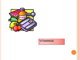 Este documento proporciona información sobre las vitaminas. Explica que las vitaminas son compuestos orgánicos necesarios en pequeñas cantidades para el metabolismo normal. Se dividen en vitaminas liposolubles (A, D, E, K) y hidrosolubles. Describe las funciones, fuentes alimenticias y deficiencias de las vitaminas A, D, E y K.