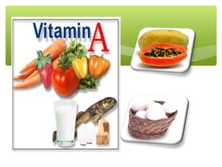 Este documento habla sobre las vitaminas. Explica que las vitaminas son compuestos orgánicos necesarios en pequeñas cantidades para el metabolismo normal. Se dividen en vitaminas liposolubles como la A, D, E y K, e hidrosolubles como la C y las del complejo B. Describe las funciones y fuentes alimenticias de algunas vitaminas importantes como la A, C, B1 y B2. También explica trastornos relacionados con la deficiencia de vitaminas como el escorbuto y el beriberi.