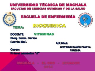 Este documento describe las vitaminas, compuestos orgánicos necesarios en pequeñas cantidades para el metabolismo normal. Explica las vitaminas liposolubles como A, D, E y K, y las hidrosolubles como C y las del complejo B. Detalla las funciones y fuentes alimenticias de cada vitamina, así como los efectos de su deficiencia.