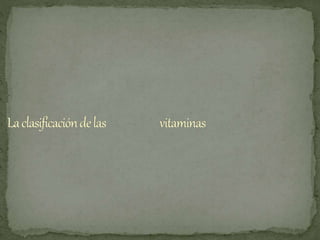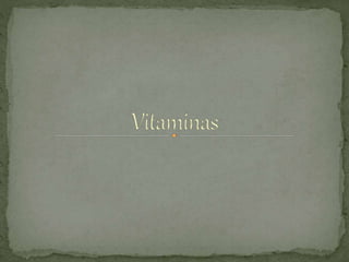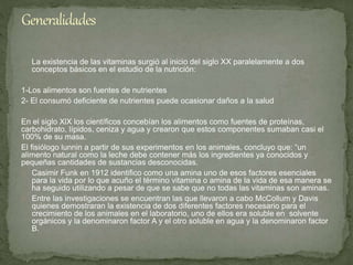 Las vitaminas surgieron a principios del siglo XX al reconocerse que los alimentos contienen nutrientes esenciales para la salud más allá de los macronutrientes como proteínas, carbohidratos y lípidos. Se descubrió que existen sustancias orgánicas como las vitaminas que son necesarias en pequeñas cantidades para el mantenimiento de funciones metabólicas. Las vitaminas se clasifican en hidrosolubles como las del complejo B y la C, y liposolubles como las A, D, E y K.