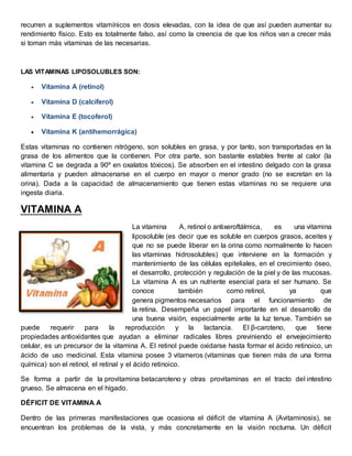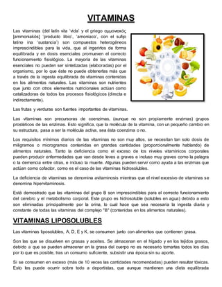 Este documento describe las vitaminas, compuestos orgánicos necesarios para la vida que no pueden ser sintetizados por el cuerpo. Explica que las vitaminas se clasifican en hidrosolubles y liposolubles. Se detalla la estructura, función y fuentes alimentarias de varias vitaminas importantes como la A, D, B y C, así como los efectos de la deficiencia y el exceso de vitaminas.