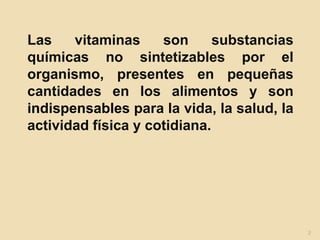 Este documento resume las vitaminas, dividiéndolas en liposolubles (A, D, E, K) e hidrosolubles. Explica brevemente cada una de las vitaminas, sus funciones, fuentes alimenticias y posibles deficiencias. Resalta que las vitaminas son compuestos químicos necesarios para la vida y la salud que el cuerpo no puede sintetizar y solo se obtienen a través de los alimentos.
