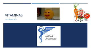 Este documento proporciona información sobre las vitaminas, incluyendo sus fuentes, funciones y deficiencias. Explica que las vitaminas son sustancias orgánicas necesarias en pequeñas cantidades y que el cuerpo no puede sintetizar o no en suficiente cantidad. Describe las vitaminas hidrosolubles y liposolubles, y luego proporciona detalles sobre las fuentes, funciones y deficiencias de las vitaminas B1, B2, B3, B6, B5, ácido fólico, B12, biotina, colina, C,
