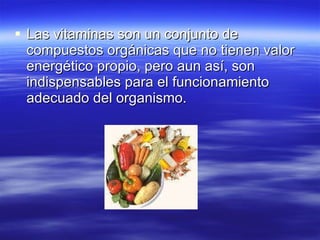 Este documento habla sobre las vitaminas, clasificándolas en dos grupos: liposolubles (A, D, E, K) y hidrosolubles (B y C). Detalla las funciones de cada vitamina, sus fuentes naturales, deficiencias y excesos. También menciona las enfermedades causadas por avitaminosis, especialmente el escorbuto en la cavidad bucal. Por último, ofrece una breve introducción sobre los ácidos nucleicos ADN y ARN.