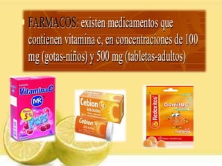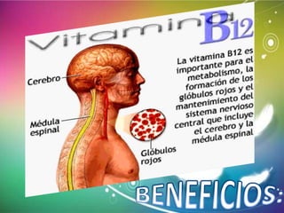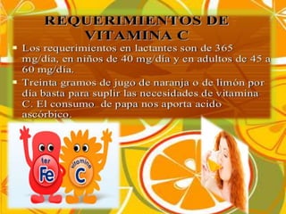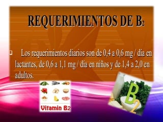 Este documento proporciona información sobre las vitaminas, incluyendo su clasificación en liposolubles e hidrosolubles, sus funciones principales, fuentes alimenticias y deficiencias. Describe las vitaminas A, D, E, K, C y el grupo B, explicando sus papeles en el metabolismo, crecimiento y desarrollo corporal. También advierte sobre los posibles efectos de las carencias y excesos de vitaminas.