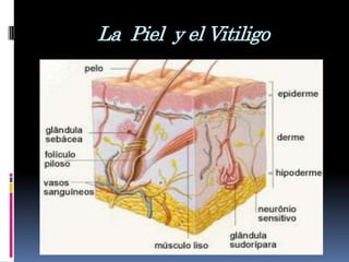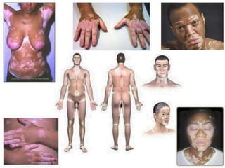 Este documento resume la enfermedad del vitiligo. Afecta aproximadamente al 1% de la población mundial y causa la pérdida de color en la piel debido a la muerte de los melanocitos. Existen varias teorías sobre las causas, como la autoinmune, la autocitotoxicidad y la neuronal. El vitiligo puede ser localizado o generalizado, y tiene diferentes tipos. El diagnóstico se basa en la apariencia de las manchas. Los tratamientos incluyen corticoides, inmunomoduladores tópicos y fot