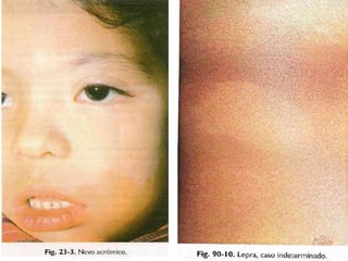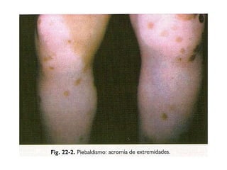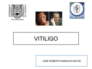 Este documento describe el vitíligo, una enfermedad de la piel caracterizada por manchas blancas debido a la destrucción de los melanocitos. Presenta varias teorías sobre su etiopatogenia, como la autoinmune o la autodestrucción. Explica los diferentes tipos de vitíligo y su diagnóstico diferencial, además de revisar opciones de tratamiento médico como corticoides tópicos, PUVAterapia, cremas inmunosupresoras y radiación UV-B.