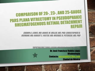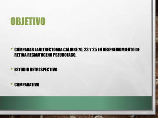 Este estudio retrospectivo comparó los resultados de la vitrectomía primaria de calibres 20, 23 y 25 en pacientes pseudofáquicos con desprendimiento de retina regmatógeno. No se encontraron diferencias significativas en los resultados anatómicos entre los tres grupos a pesar de las variaciones en el tipo de láser y gases utilizados. La vitrectomía primaria de calibre pequeño es una opción efectiva para el manejo de desprendimientos de retina en pacientes pseudofáquicos.