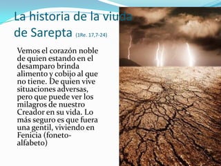 El documento resume la historia bíblica de la viuda de Sarepta, quien brindó alimento y cobijo al profeta Elías cuando estaba en desamparo. A pesar de vivir en situaciones adversas y estar preocupada por su futuro, la viuda confió en el mensaje de Elías y lo alimentó. Más tarde, cuando su hijo enfermó y murió, Elías oró a Dios y el hijo de la viuda fue resucitado. La viuda reconoció entonces que Elías era un hombre de Dios y que la palabra de Dios era ver