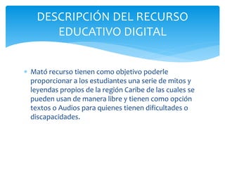 Este documento describe un recurso educativo digital que presenta mitos y leyendas de la región del Caribe a través de textos o audios, para que los estudiantes puedan usarlos libremente. Incluye enlaces a imágenes de Pixabay e información bibliográfica.
