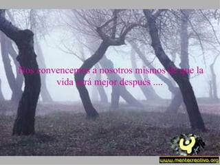 El documento argumenta que las personas tienden a pensar que serán más felices en el futuro después de lograr ciertas metas, como terminar la universidad o tener hijos, pero que en realidad no hay un mejor momento para ser feliz que el presente. Aconseja dejar de esperar el futuro y decidir ser feliz ahora, ya que el tiempo no espera a nadie y la felicidad es un camino, no un destino.