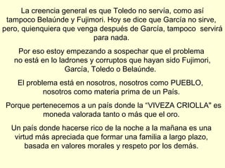 Este documento analiza los problemas fundamentales del Perú y argumenta que la raíz de estos problemas se encuentra en los propios peruanos y sus defectos como "materia prima" de la nación, incluyendo la "viveza criolla", la deshonestidad, la falta de valores y la indiferencia hacia los demás. Señala que hasta que los peruanos no cambien y corrijan estos defectos, ningún presidente podrá hacer mucho para mejorar el país, por lo que el cambio debe comenzar desde abajo.