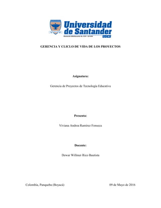 Este documento presenta una introducción a la gerencia y ciclo de vida de los proyectos en el contexto educativo. Explica que para que los proyectos tengan éxito se deben establecer parámetros claros, planear acciones y manejar presupuestos adecuadamente. Luego describe los métodos comunes de administración de proyectos como Grantt, PERT y CPM. Finalmente, resume las fases del ciclo de vida de un proyecto que incluyen iniciación, planificación, ejecución, seguimiento y cierre.