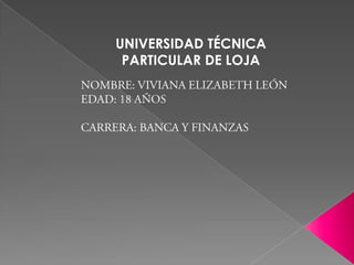La estudiante Viviana Elizabeth León de 18 años de la Universidad Técnica Particular de Loja cursa la carrera de Banca y Finanzas. Explica que un blog es un sitio web donde los autores publican artículos u opiniones de forma cronológica y comparten conocimiento con libertad. Menciona que blogs gratuitos se pueden crear en Wordpress, Wallinside y Blogger de Google, y que las ventajas de los blogs incluyen compartir información sin costo, promocionar empresas, y debatir ideas.