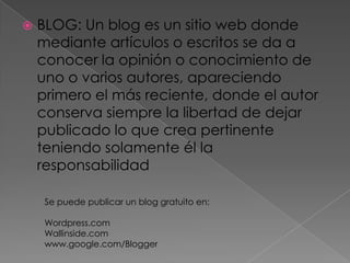 BLOG: Un bloges un sitio web donde mediante artículos o escritos se da a conocer la opinión o conocimiento de uno o varios autores, apareciendo primero el más reciente, donde el autor conserva siempre la libertad de dejar publicado lo que crea pertinenteteniendo solamente él la responsabilidadSe puede publicar un blog gratuito en:Wordpress.comWallinside.comwww.google.com/Blogger