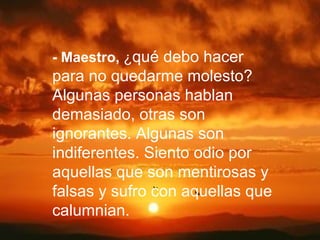El maestro le aconseja al discípulo que viva como las flores para no molestarse con los defectos de los demás. Las flores nacen en el barro pero permanecen puras y perfumadas, extrayendo solo lo que les es útil y saludable sin permitir que lo malo las manche. Del mismo modo, es sabio preocuparse por sus propias faltas pero no molestarse por los vicios ajenos, y en lugar de eso, hacer el bien a los demás.