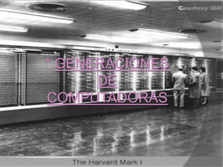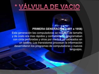 La primera generación de computadoras utilizó válvulas de vacío y se programaban con cinta perforada o cableado. La segunda generación introdujo los transistores, haciendo las computadoras más rápidas, pequeñas y eficientes energéticamente. La tercera generación vio el desarrollo de circuitos integrados en pastillas de silicio. La cuarta generación trajo los microprocesadores y memorias de silicio, permitiendo computadoras personales más pequeñas.