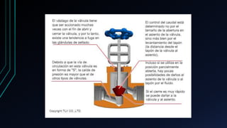 La válvula globo recibe su nombre por la configuración de su cuerpo con una abertura circular que puede cerrarse moviendo un disco o introduciendo un macho cónico en un asiento. Se usa para controlar el caudal o para funcionamiento de apertura y cierre, y está disponible en diversas construcciones. Tiene ventajas como regular flujo desde moderado a pleno y producir buen cierre, pero también desventajas como disminuir la presión y dañarse fácilmente el asiento.