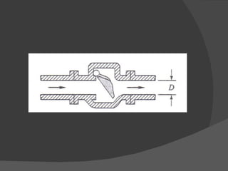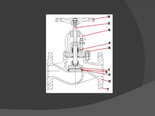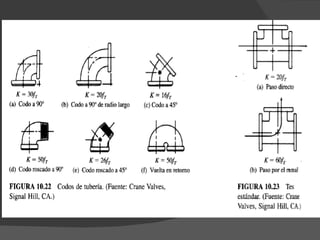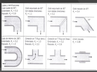 Las válvulas son dispositivos que controlan el flujo de fluidos en sistemas de tuberías mediante la apertura, cierre u obstrucción parcial. Tienen partes comunes como el obturador, eje, asiento y cuerpo. Existen diferentes tipos como de globo, compuerta y mariposa, que varían en la trayectoria del flujo y pérdidas de energía. Accesorios como codos, tes y reducciones se usan para cambiar la dirección o tamaño de las líneas.