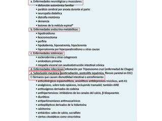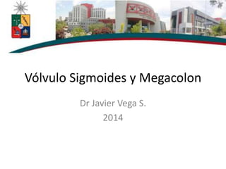 El documento describe el vólvulo sigmoides y el megacolon, sus causas, síntomas y tratamientos. El vólvulo sigmoides ocurre cuando el sigmoides se tuerce, obstruyendo el intestino. Puede tratarse endoscópicamente o quirúrgicamente. El megacolon es una dilatación anormal del colon y puede ser congénito o adquirido. Las causas incluyen enfermedad de Hirschsprung y síndrome de Ogilvie. No hay un tratamiento único para el megacolon y la elección depende