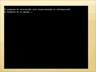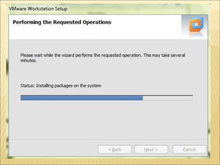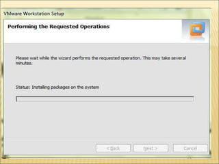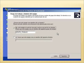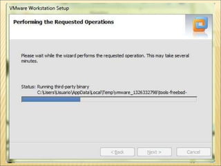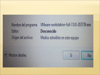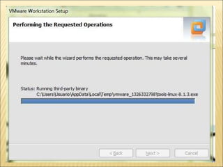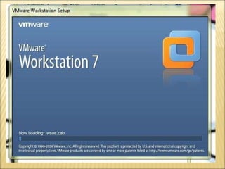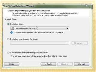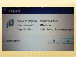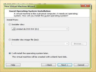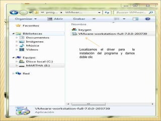 El documento proporciona instrucciones detalladas para instalar el programa VMware y el sistema operativo Windows XP en una máquina virtual. Incluye pasos como encontrar el driver de instalación de VMware, crear una nueva máquina virtual, seleccionar el sistema operativo, particionar y formatear el disco duro virtual, e instalar y configurar Windows XP.