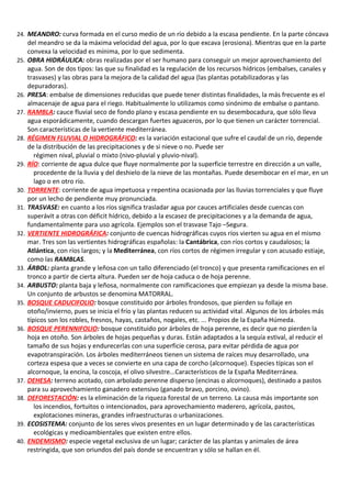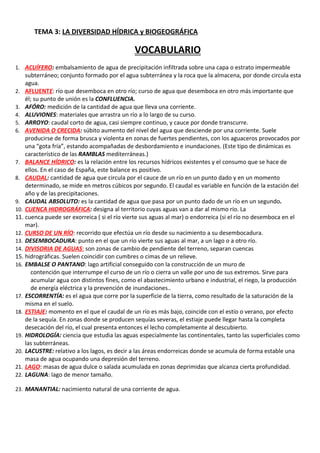Este documento proporciona definiciones de 60 términos relacionados con la hidrología, biogeografía, vegetación y suelos de España. Describe conceptos como cuenca hidrográfica, río, acuífero, bosque caducifolio, dehesa, xerófila y otros. El documento ofrece información sobre la diversidad hídrica y biogeográfica de España a través de definiciones detalladas de términos técnicos.