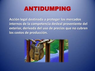Este documento define varios términos económicos y financieros como antidumping, ad valorem, boicot, broker, cash flow, clearing, déficit, dumping, fas, fob, holding, leasing, marketing, per cápita, royalty y trust.
