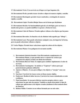 El documento describe los diferentes menús, herramientas y funciones disponibles en el software de edición de películas Flash. Explica las funciones de los menús Archivo, Edición, Ver, Insertar, Texto, Modificar, Comandos, Ventana, Control y Ayuda. También describe las diferentes herramientas de dibujo, edición y animación como la herramienta Selección, Línea, Texto, Óvalo, Rectángulo, Lápiz, Brocha, entre otras. Por último, explica conceptos clave como escenario, línea de
